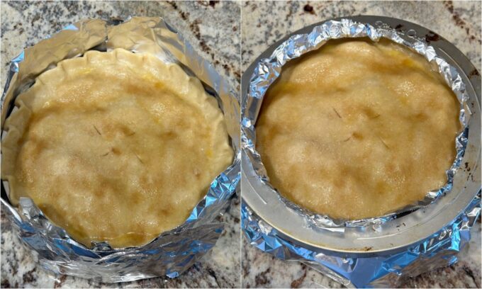 Option 1: Buy the cheapest flimsy aluminum foil you can find, not heavy duty. I find it at the dollar store and it’s perfect. Tear off long strips about four inches wide. Place pieces together around the pie crust by stapling the end pieces together. That’s right! Staple them!! After you staple them, slightly bend the foil inward towards the center of the pie. You can form the foil around the pie edges allowing for extra room around pie dish handles and it won’t mess up the edges. It’s light weight! Then, you can place a pie shield over it, if you prefer, to help secure the foil.
