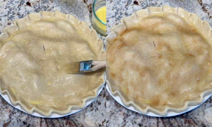 - Brush the top crust with a pie wash, such as egg yolk and water, followed by a sprinkling of sugar or cinnamon and sugar mixed.