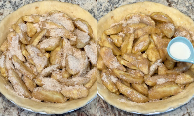 - Peel and slice the apples into thin slices, no more than 1/4″ thick and add to a large bowl. Add the dry ingredients and mix with a large spoon, spatula or your hands until all of the apples are coated with the dry mixture. Turn the apples into the pastry lined pie dish. Drizzle the half & half or cream over the apples.