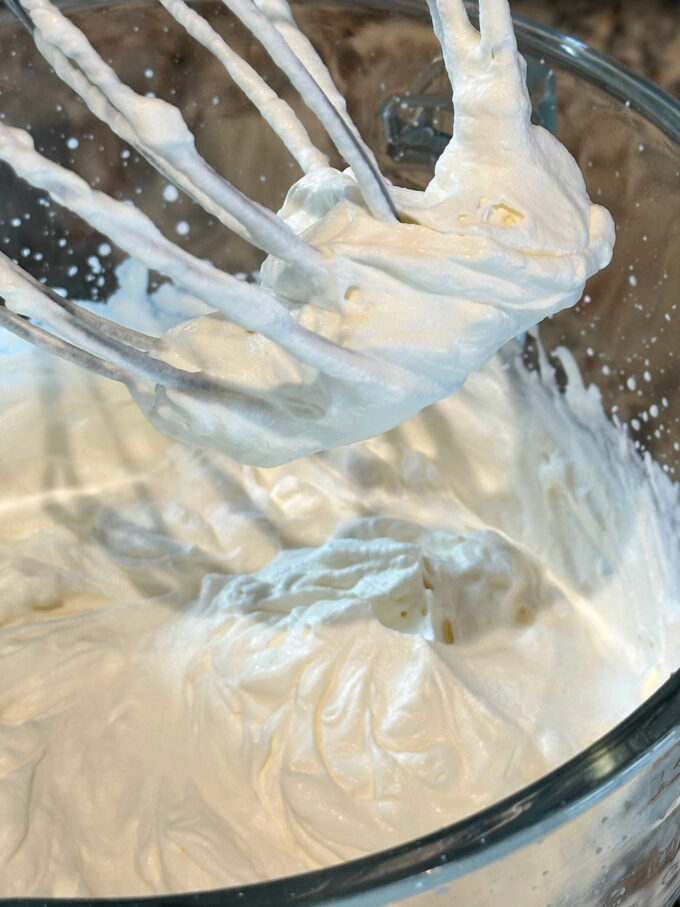 For the whipped cream, I simply added 1 1/2 cups of heavy whipping cream to my stand mixer. I added 1/3 cup of powdered sugar and 1 teaspoon of vanilla. I whisked it (using the whisk attachment) for about 1 minute until it was thick.