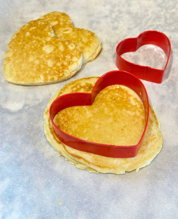 - Using a large heart shaped cookie cutter, cut out hearts with each pancake. I like to use a metal cookie cutter. However, plastic will work too. Here’s what I do. I cut out large hearts first. Then I cut smaller hearts with the pancake that’s leftover from around the large heart. You can do them however you prefer. I save any scraps to feed to my nightly visitor, Ozzy the possum. You can feed yours to your pet possum or your husband. Ha!