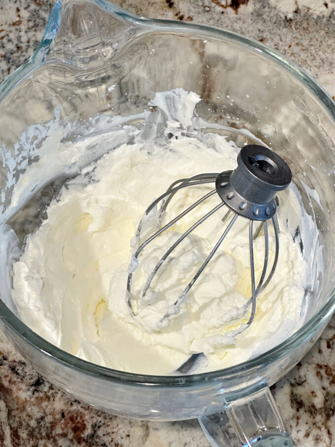 - Add the whipping cream, powdered sugar and peppermint extract to the bowl of a stand mixer fitted with the paddle attachment. Whisk on low for a few seconds and gradually increase speed as the whipping cream starts to thicken. Whisk until the cream turns into to medium soft peaks.