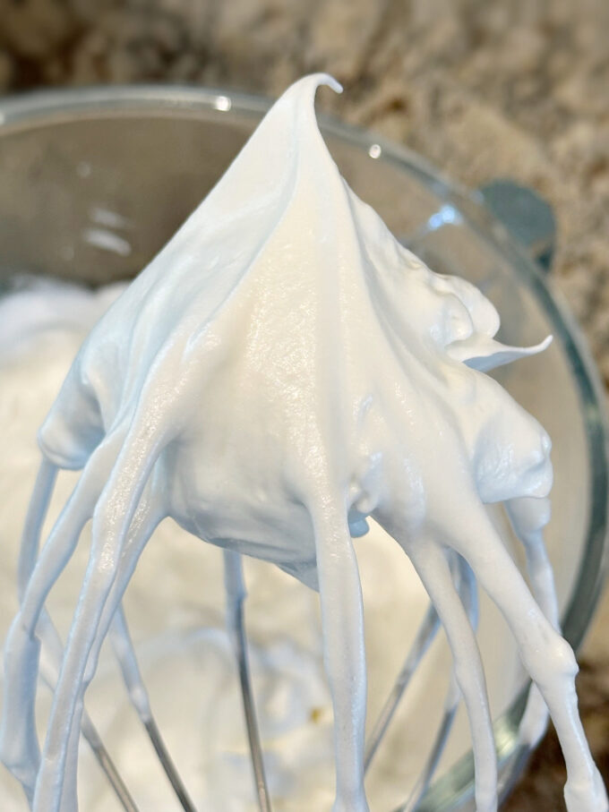 - Pour the mixture into the bowl of a stand mixer, if you don’t already have it in the mixer bowl. Whisk mixture on low speed for a few seconds, gradually increasing speed to high. Whisk until mixture becomes stiff, and looks glossy and satiny. Peaks should stand on their own.